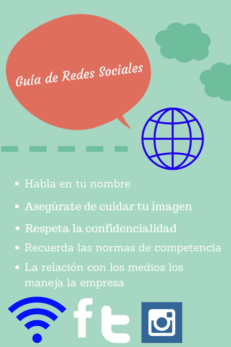 - Responsabilidades legales: Es importante que se señale que existen responsabilidades legales frente a todo lo que uno escriba o promueva a través de sus redes y que la compañía tiene el derecho de tomar acciones al respecto.